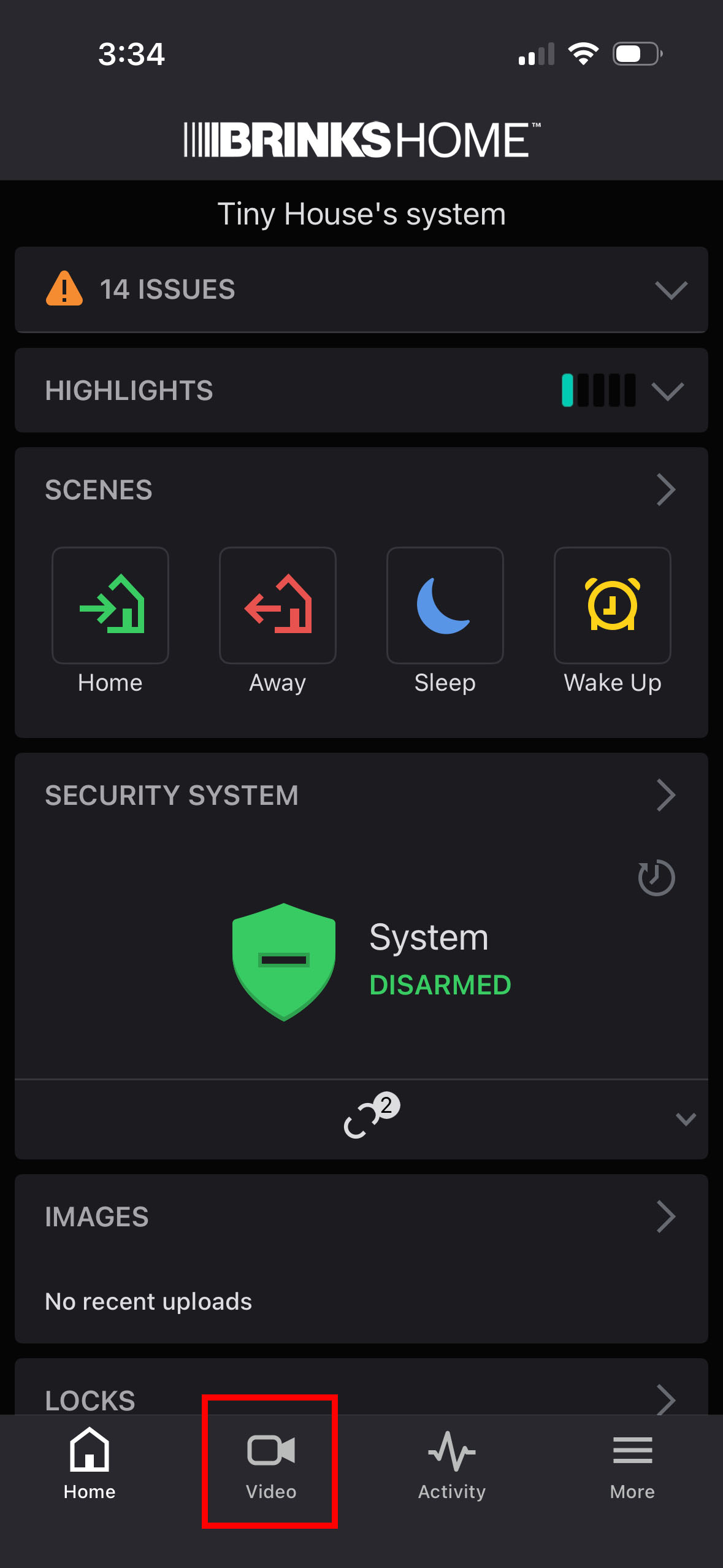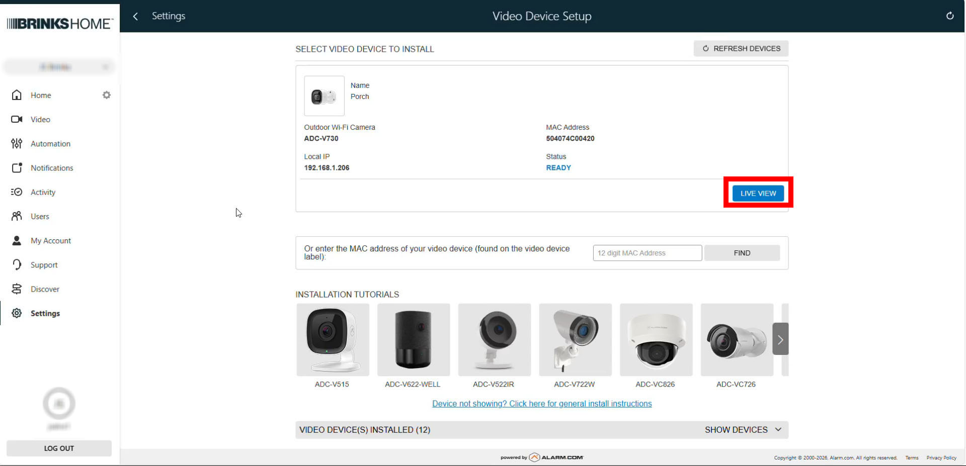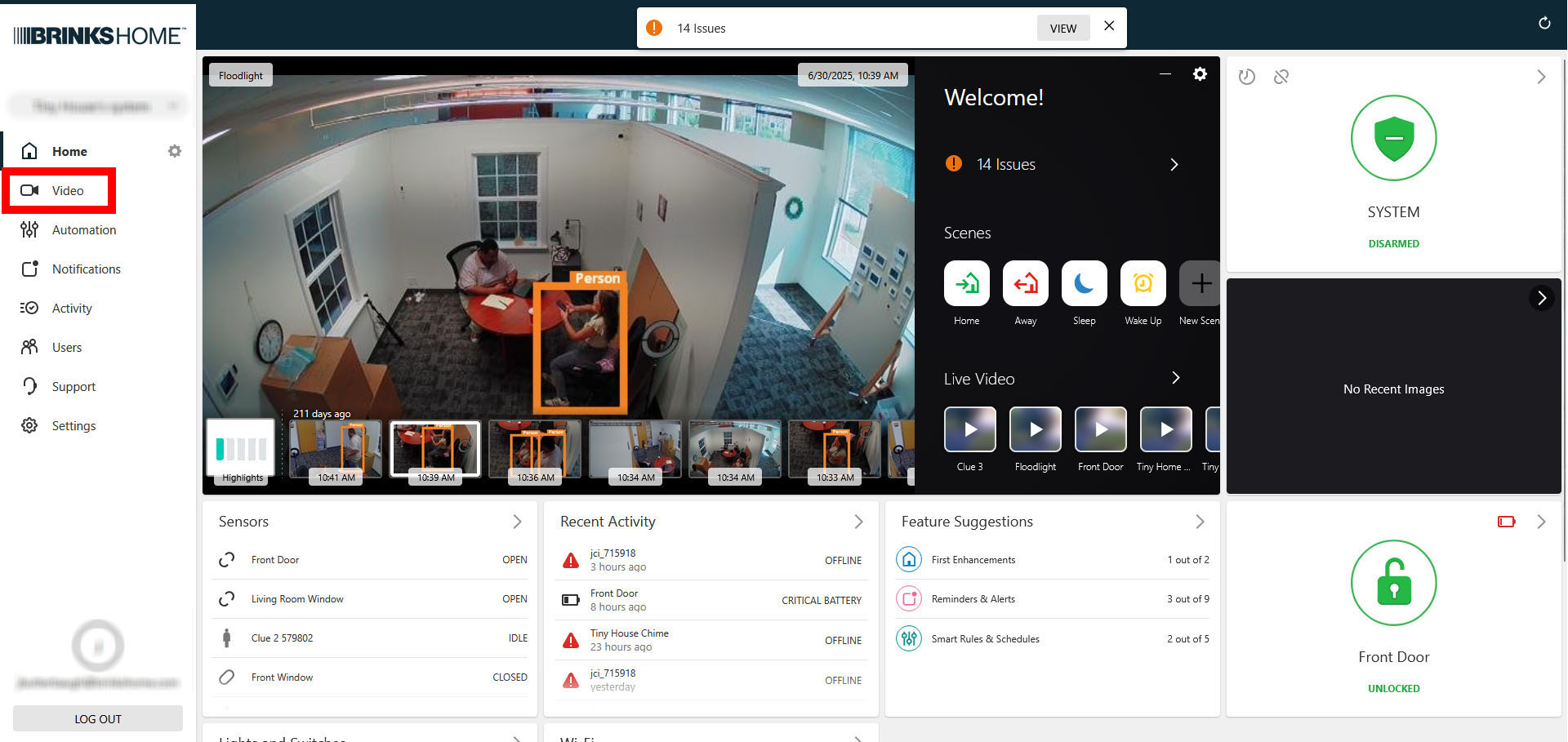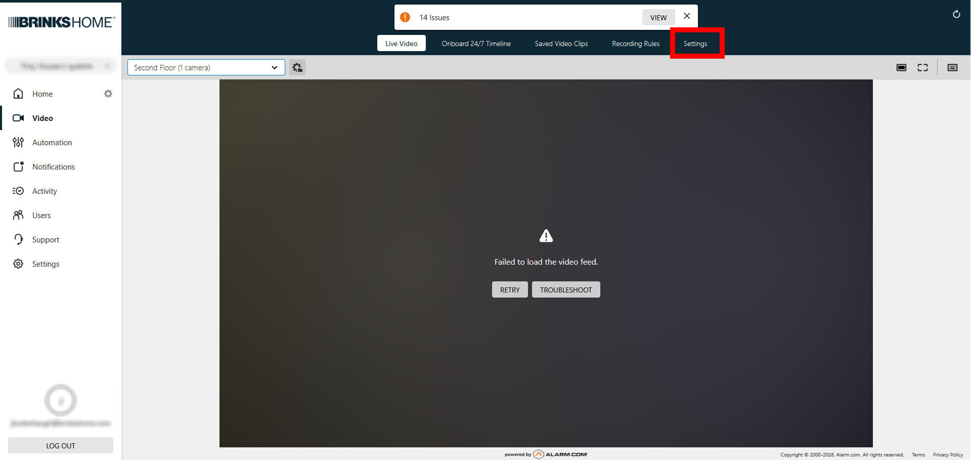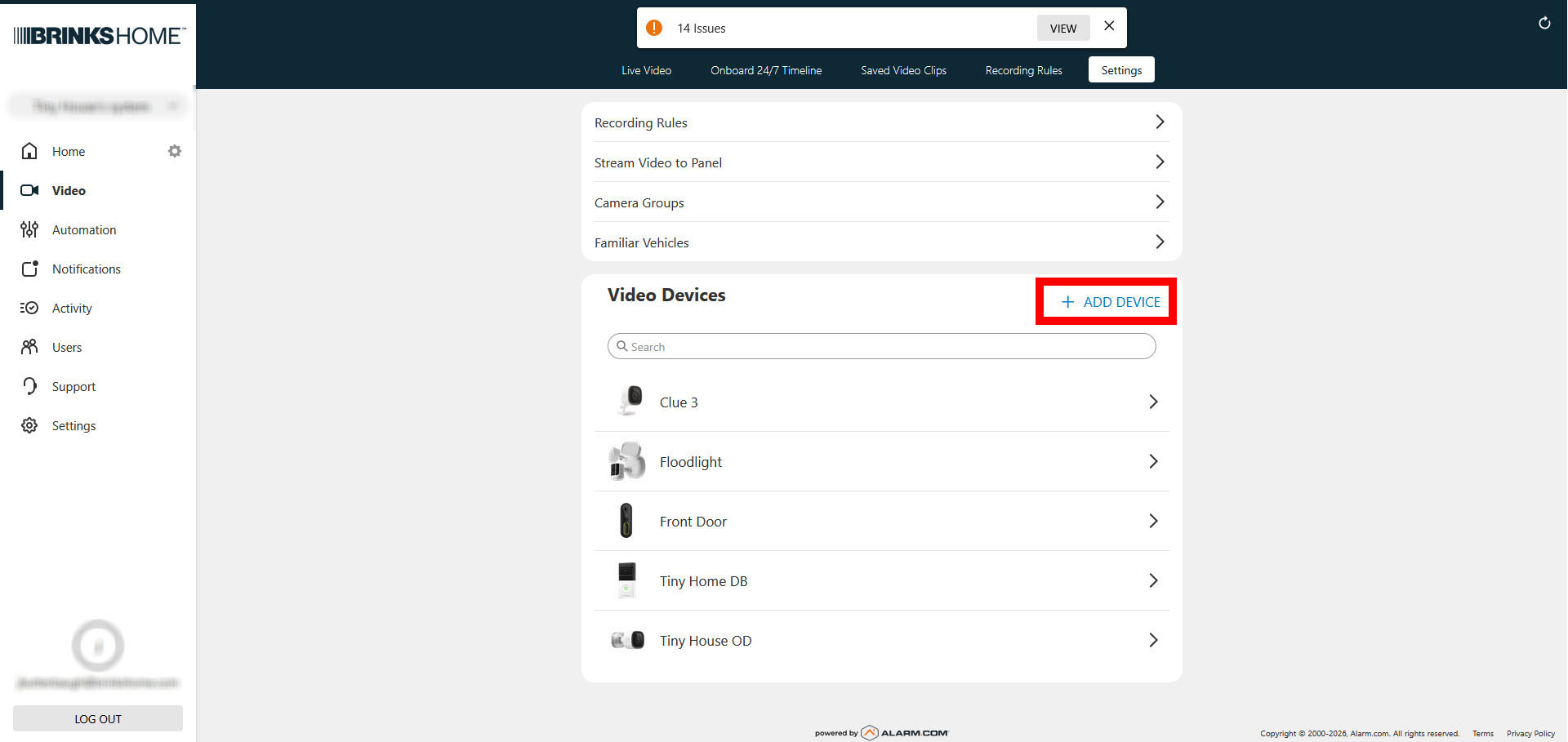 - Log in to the Brinks Home Alarm.com website, then select Video.